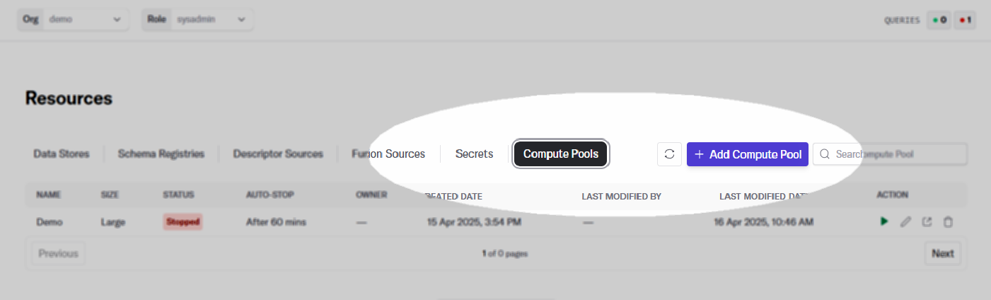 2. Click to activate the **Compute Pools** tab.  Then click **+ Add Compute Pool**.<br>