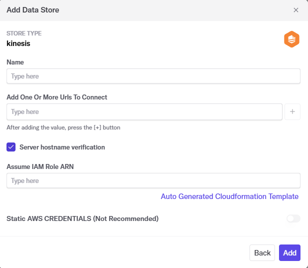 We recommend you use an assumed IAM role to authenticate with Kinesis stores (below). We do not recommend you use AWS credentials.
