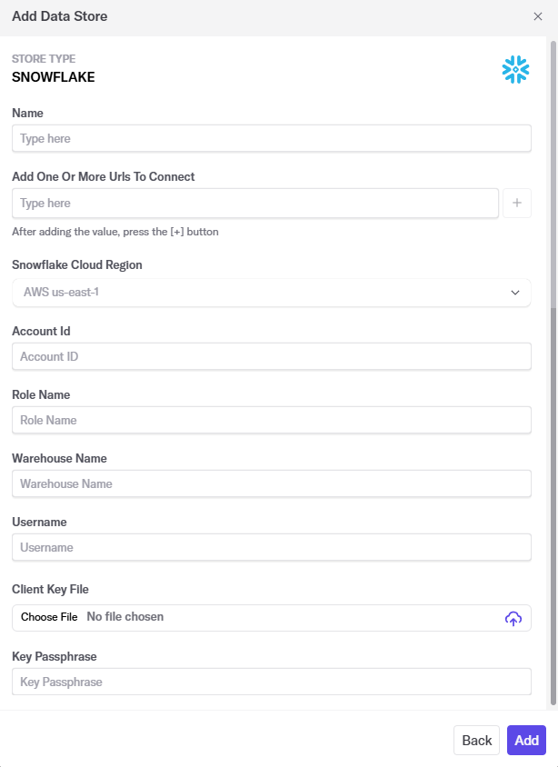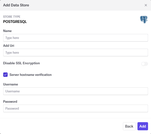 Complete the authentication options as appropriate for the data store. See below for more information.