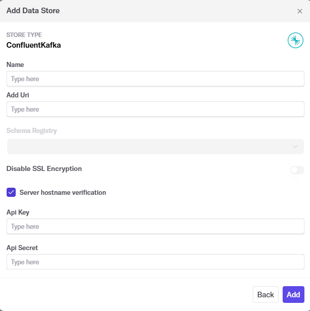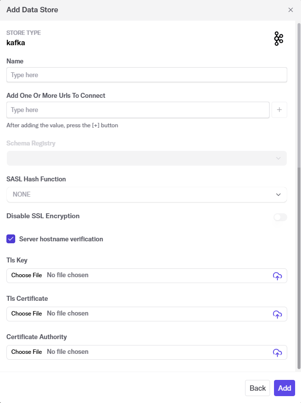 Click + Add Store, and from the menu that displays click the data store type you want (in this case, Kafka).