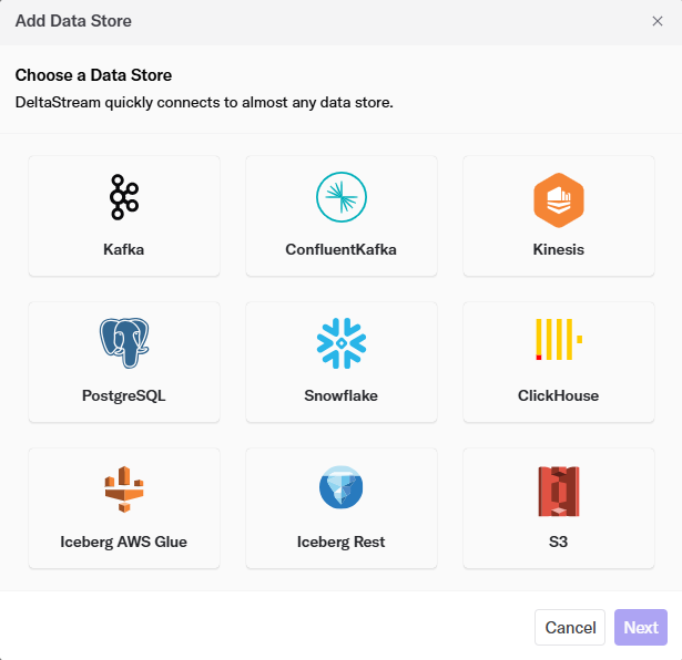 Before you write any queries, you must configure DeltaStream to connect to the data store where data resides. This article shows how to use the Web application to create a data store.