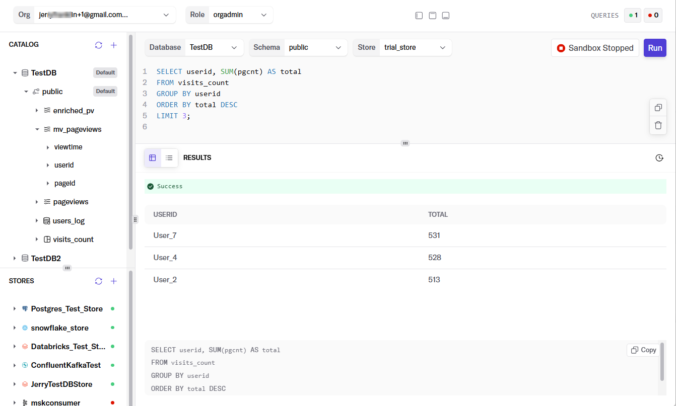 To review the details on the above two objects, in the lefthand navigation click **Databases** ( ![](https://1288764042-files.gitbook.io/~/files/v0/b/gitbook-x-prod.appspot.com/o/spaces%2Fdbd9e6ZJodkgF1H6AVay%2Fuploads%2FjIZqlsIKT1YZq6PndUbH%2FCatalogIcon.png?alt=media\&token=ec5414ec-ee13-496c-a043-ef2f39cc8855) ), and drill down on the database to display your stream&#x73;**.**