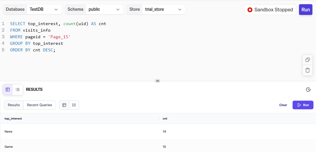 As another example, you can find top interests of all the users who have visited a specific page (such as `Page_15`) so far and sort them according to the total user count per interest.