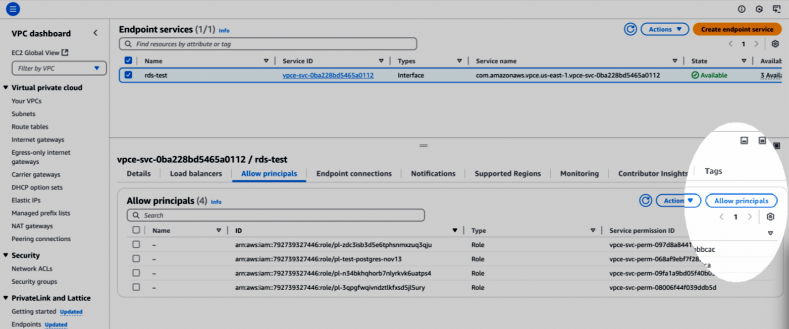 After you have set up the endpoint service, gather the RDS hostname and RDS Endpoint Service name and insert the variables: