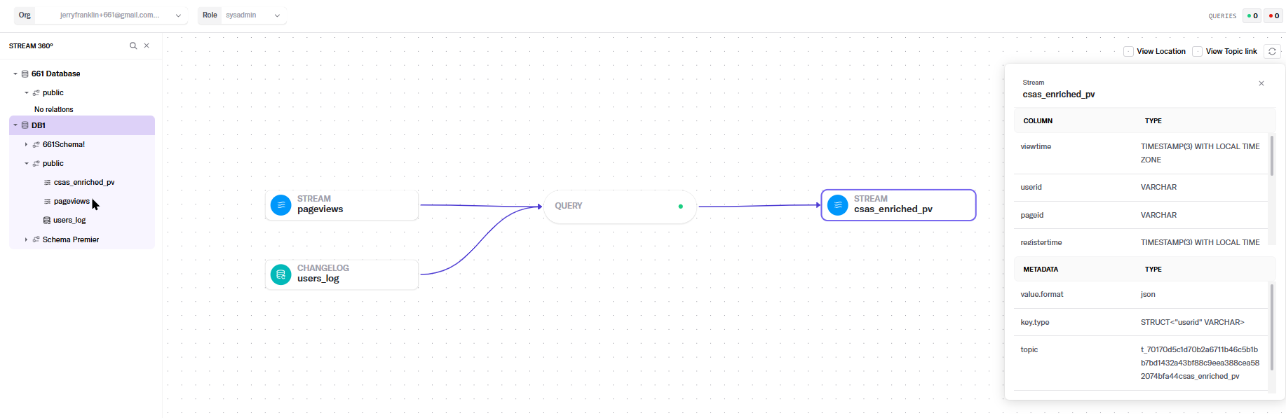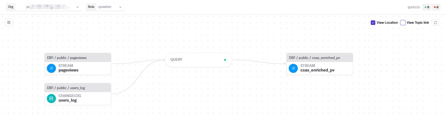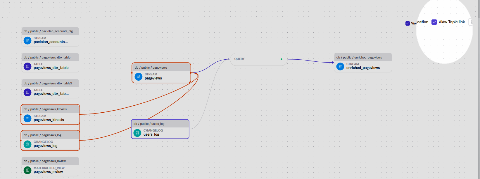 And in this example, the final result – the **enriched pageviews** stream – is selected. The lines that represent the flow of all the objects involved in this enriched stream are highlighted, and details of the enriched stream display in the side panel.