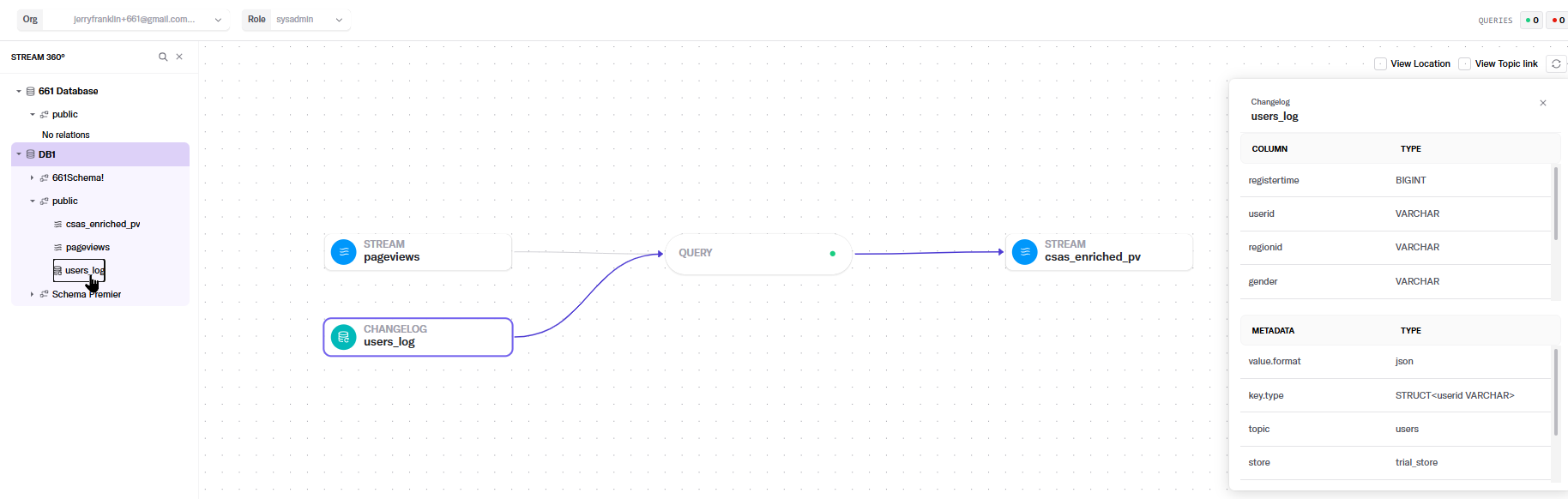 In the simple example below, we selected the **users\_log** changelog. Its flow from object to enriched stream is highlighted, and details display in a panel on the right.